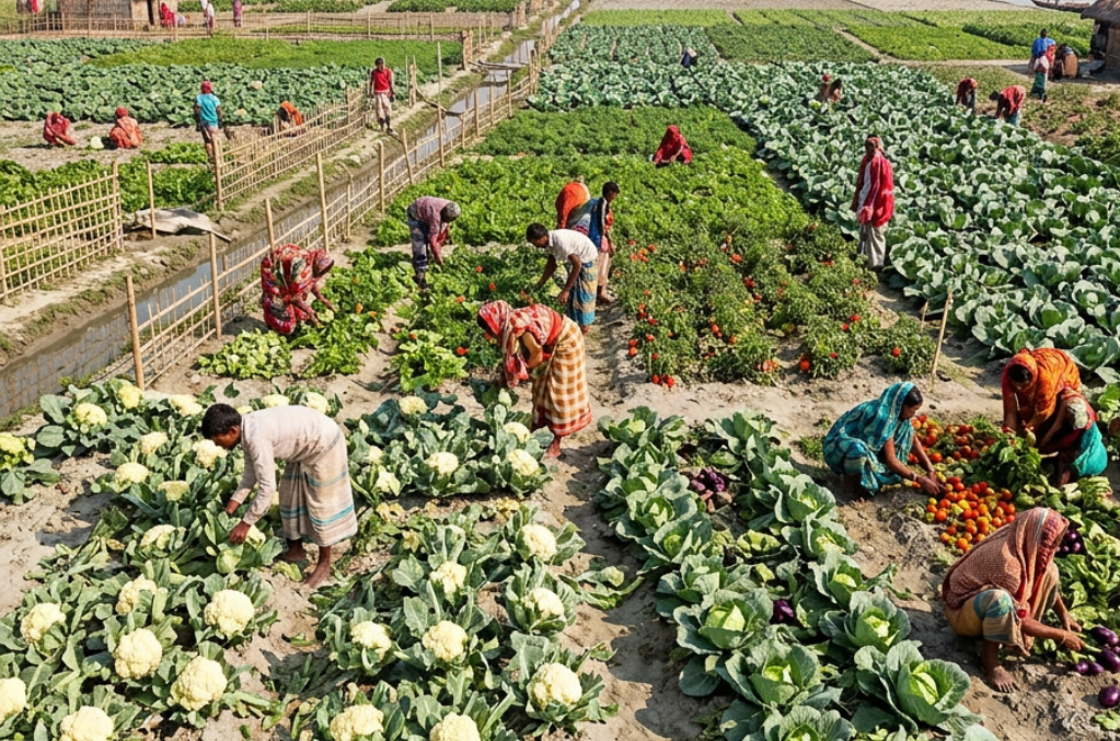 A bumper harvest of winter crops in the riverine char areas of the Rangpur region is filling homes with grain and hearts with fresh hope, as small farmers and day labourers see strong yields and good prices lifting years of worry. On sandbars, dry riverbeds and newly formed islands along major rivers, families have turned once-barren land into green fields of vegetables, pulses and oilseeds using smart intercropping, mixed-relay planting and organic fertiliser, and this season their hard work is clearly paying off. Local agriculture officers say crops such as groundnut, potato, onion, pumpkin, brinjal, chilli and leafy vegetables are coming in with excellent yields, while fields of boro rice, wheat and mustard add to the harvest and keep the local food supply strong. Farmers in the char villages explain that they now use every bit of land by planting quick-growing vegetables between rows of longer-season crops, which helps protect the soil, control weeds and bring in regular cash from nearby markets. Many households report earning solid profits from selling cucumber, pumpkin, green chilli and maize, money that they plan to spend on better food, small repairs to their homes and school needs for their children. The wider char economy is also feeling the benefit as traders, transport workers and market vendors handle higher volumes of produce, creating more short-term jobs and supporting small businesses that sell seeds, tools and fertiliser. Agricultural experts estimate that crops grown on charlands across several districts in the region now add hundreds of thousands of tonnes of food each year, worth many hundreds of crores of taka, turning areas once seen as fragile into important production zones. Farmers say that repeated good harvests have taught them which crop mixes cope best with sandier soils, flood risks and sudden weather changes, and they are eager to adopt new advice on water management and improved seed varieties. Community members add that strong harvests bring social benefits too, as families are more able to support neighbours in need, contribute to local schools and religious centres and save a little for emergencies instead of living season to season. Local leaders hope that better rural roads, storage facilities and fair pricing will build on this success so that farmers keep a larger share of the value from their crops. Many believe that if this momentum continues, the char areas of Rangpur can become a shining example of how innovation, training and patience can transform vulnerable lands into vibrant farming communities where people look to the future with confidence and steady, growing optimism.