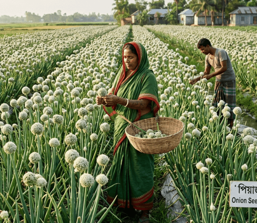 Faridpur’s onion seed farmers are heading toward a large harvest that could be worth about Tk550 crore, as the district’s famous “black gold” fields spread across the area and draw strong demand from buyers across Bangladesh. Farmers and local agriculture officials expect production to reach nearly 1,100 tonnes, a sign that the district remains one of the country’s most important onion seed hubs. Faridpur is known for producing around 70 per cent of the nation’s onion seeds, and its seeds are valued for their quality and steady market demand. The crop is not easy to grow, though, and many farmers say the work has become harder because bee numbers have dropped, forcing them to do pollination by hand. In fields such as Gobindapur village, workers carefully move pollen from flower to flower, a slow job that needs patience, skill, and long hours. Some labourers say the work is tiring, but the income helps support their families. Farmers also say the low rainfall has helped improve seed quality, even as the cost of production remains high. One experienced grower said she has planted nearly 100 acres and hopes to harvest around 40 tonnes of seed, which could bring her a market value of about Tk5 crore. That kind of return shows why many local growers continue to stay with the crop despite the risk and effort involved. The total area under onion seed cultivation in Faridpur has also slightly crossed the target set by the agriculture office, with nearly 1,865 hectares planted instead of the planned 1,850 hectares. Most of this production is centered in Gobindapur, where the crop has become a major source of income and local pride. Last year’s market price was about Tk5,000 per kilogram, and many farmers expect a similar level this time. Local producers say Faridpur seeds are trusted because of their superior quality, and buyers from other parts of the country often come directly to the district to collect them. Officials say the district’s crop could help the wider farm economy if the harvest stays strong. They are giving farmers technical support and checking seed quality to help protect the crop and improve results. The fields have also become a place of interest for visitors, who come to see the white flowers that cover the land like a bright seasonal carpet. For many people in Faridpur, onion seed farming is more than a business. It is a skilled rural trade that brings income, supports workers, and adds real value to the country’s agriculture.